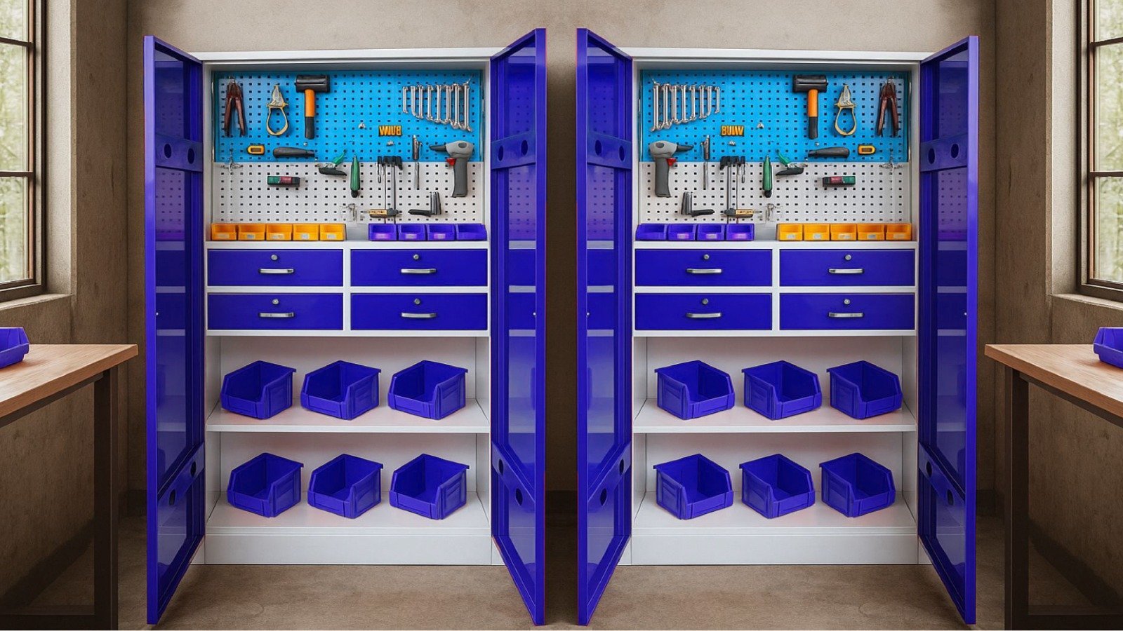 The tool cabinet provides efficient storage with multiple drawers for organizing tools and accessories. Built for durability, it keeps your workspace clean and productive.