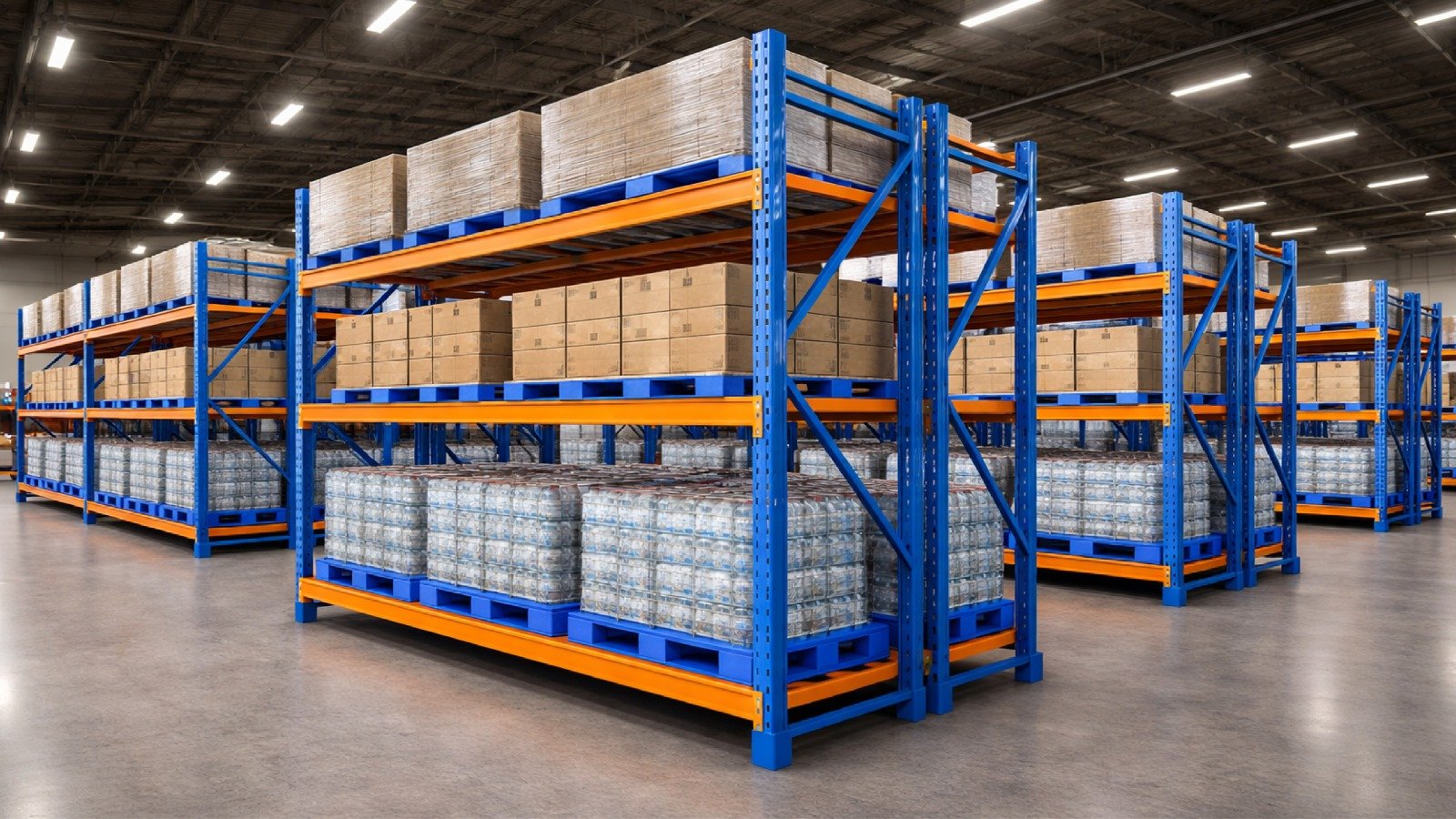Industrial pallet racking system designed for high-capacity warehouse storage. Enhances space utilization and allows easy forklift access for smooth operations.